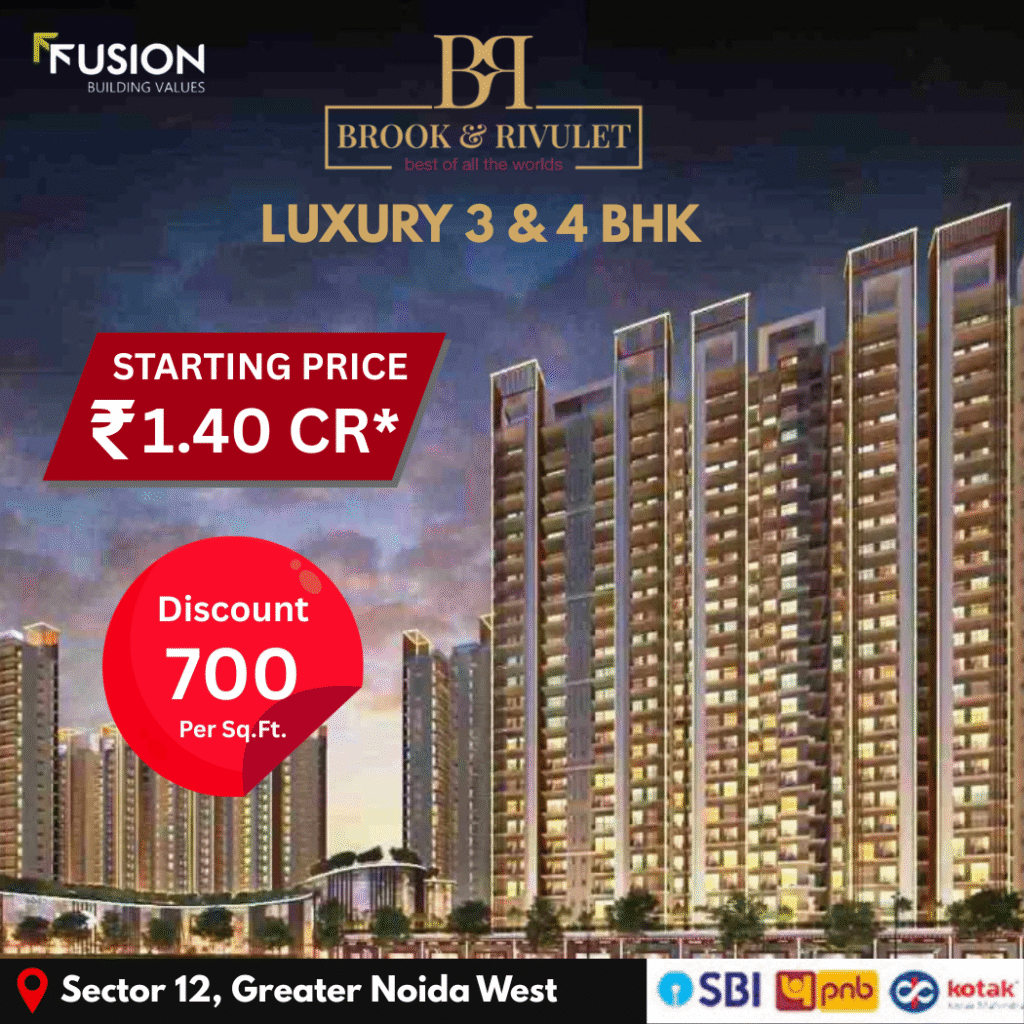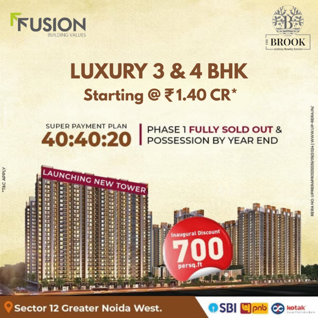 Fusion Group’s The Brook located in Sector 12, Greater Noida West, is a luxury residential development designed to offer modern living with a host of contemporary amenities. Spread over about 12.5 acres, This project features well-planned apartments in configurations such as 3 BHK and 4 BHK layouts. The project boasts three-side open plots, wide balconies that are either park-facing or road-facing, and high ceilings to enhance space and comfort.